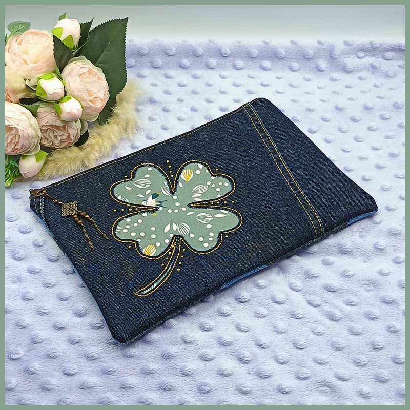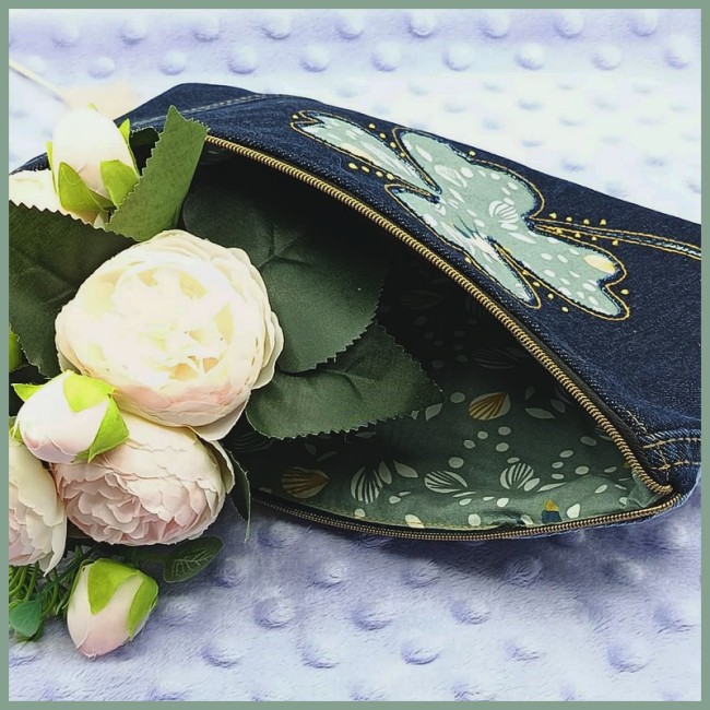 Laissez-vous séduire par cette création unique de la collection Révélation. Alliant la robustesse du denim recyclé à la douceur d’un motif printanier, cette trousse est une véritable ode à la nature et au savoir-faire artisanal. Le trèfle, symbole de chance, est révélé par une technique d'appliqué inversé qui laisse apparaître un tissu délicat orné de petits oiseaux et de motifs végétaux.