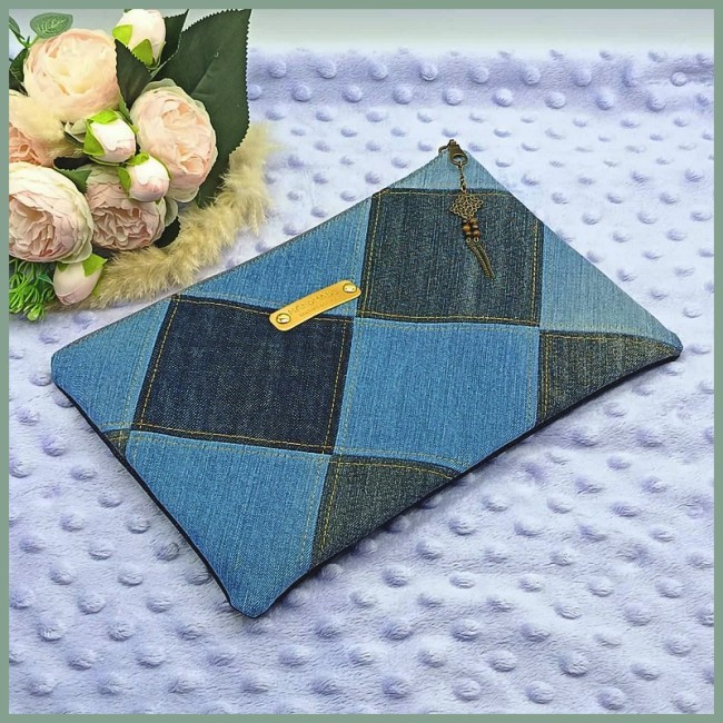 Face Arrière : Un patchwork géométrique de denims aux nuances variées, assemblé avec des surpiqûres contrastantes pour un look moderne et graphique.